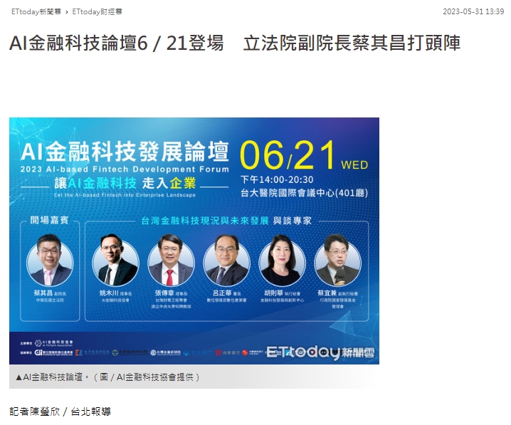 AI(人工智慧)興起促成應用層面的放大,AI金融科技協會將在6月21日由立法院副院長蔡其昌打頭陣,數發部產業發展署署長呂正華與重量級產、政、學、研等多名專家共議,以嚴謹學術觀點加值珍貴實務經驗,提供政府AI金融技技之政策擬定方針。
